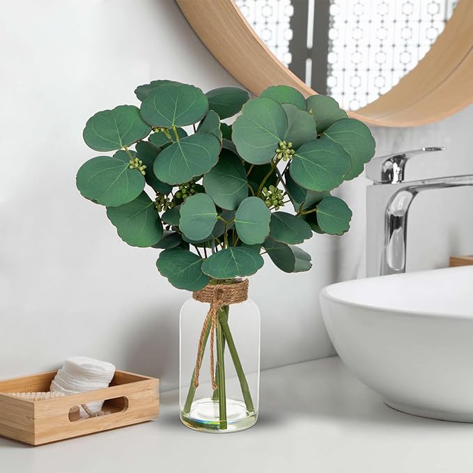 - LOVELY TEXTURAL APPEAL: Intricately crafted from high-quality silk and plastic materials, our fake eucalyptus bush in vase with faux water will add a splash of natural texture and a riveting pop of color to your other decorations. Liven up your interior design, office, or party decor with this stunning lifelike eucalyptus foliage to impart a modish appeal.