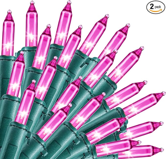 - Super Value Pack: Light up the upcoming Valentine's Day with pink lights through JOIEDOMI string lights.Our pink christmas lights have a total of 200 incandescent T5 bulbs with green wire. 40.8W 120V. Total Lighted Length is 39Feet. Total Wired Length is 43Feet. Bulb Spacing 2.36 inches.