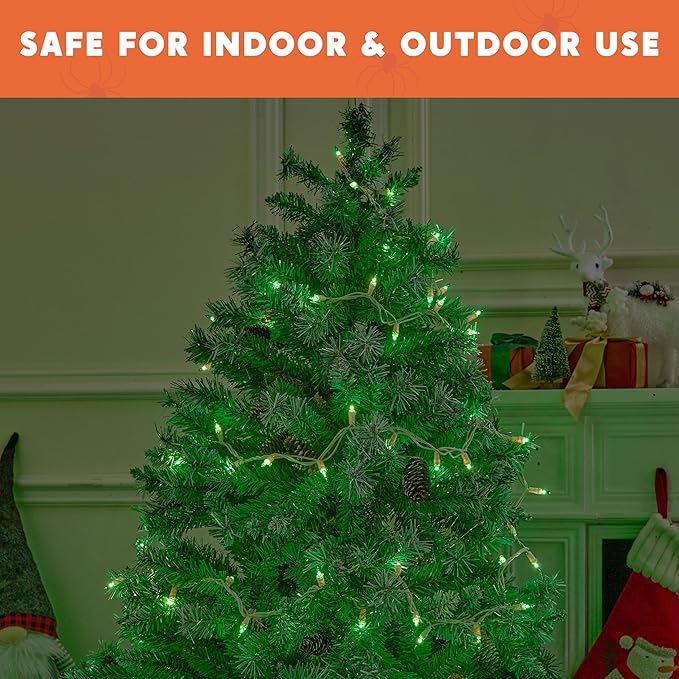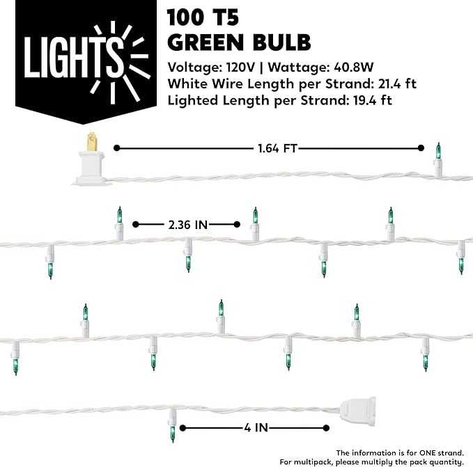 - Super Value Pack: 100 Emerald Green Bulbs on 21.4 ft Wire.Create a natural oasis with 100 rich green bulbs on a 21.4 ft white wire, featuring a lighted length of 19.4 ft with 2.36 inch spacing. These high-quality Christmas lights deliver lush, verdant illumination perfect for enhancing trees, lining rooftops, or adding a touch of nature to any space.