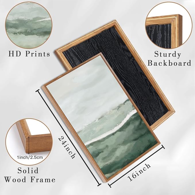 - 【Premiun Quality Material】The sage green wall art set is 16x24 inch.Each abstract green painting is made with high quality canvas and ink, and we utilize the latest printing technology to make the paintings fade-resistant. In addition, the sturdy frame and solid backing protect the painting from damage during transportation.