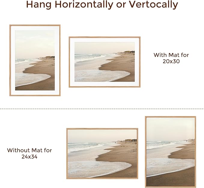 - NATURAL SOLID OAK WOOD FRAME - This 24x34 picture frame is made of high-quality 100% solid oak wood, the natural wood grains on this real oak wood picture frame lends it an authentic look. This poster frame comes with 1.2mm ivory mat for visualizati on purposes, and 24 x 34 frame with mat for 20 x 30