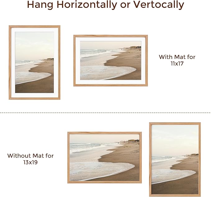 - NATURAL SOLID OAK WOOD FRAME - This 13x19 picture frame is made of high-quality 100% solid oak wood, the natural wood grains on this real oak wood picture frame lends it an authentic look. This poster frame comes with 1.2mm ivory mat for visualizati on purposes, and 13 x 19 frame with mat for 11 x 17