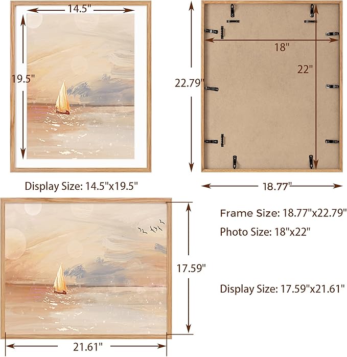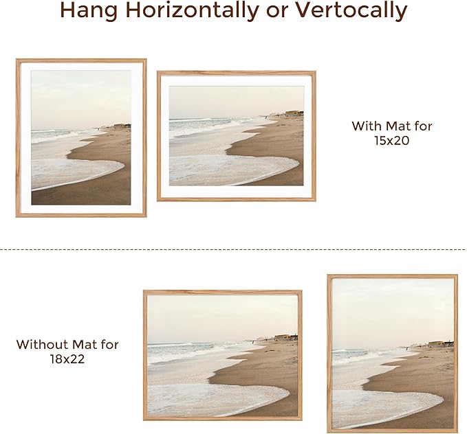 - NATURAL SOLID OAK WOOD FRAME - This 18x22 picture frame is made of high-quality 100% solid oak wood, the natural wood grains on this real oak wood picture frame lends it an authentic look. This poster frame comes with 1.2mm ivory mat for visualizati on purposes, and 18 x 22 frame with mat for 15 x 20