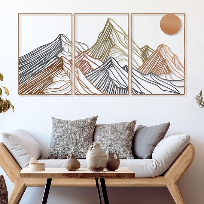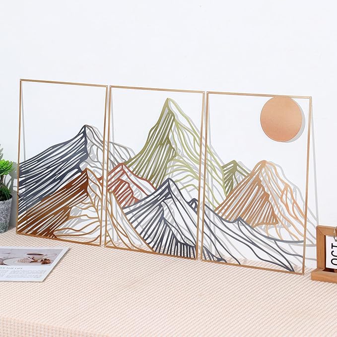 Zzbakress 3 Pcs Colorfor Mountain Metal Wall Decor - Minimalist Sunrise Line Art Abstract Living Room Rustic Bathroom Large Wall Art (Vivid)