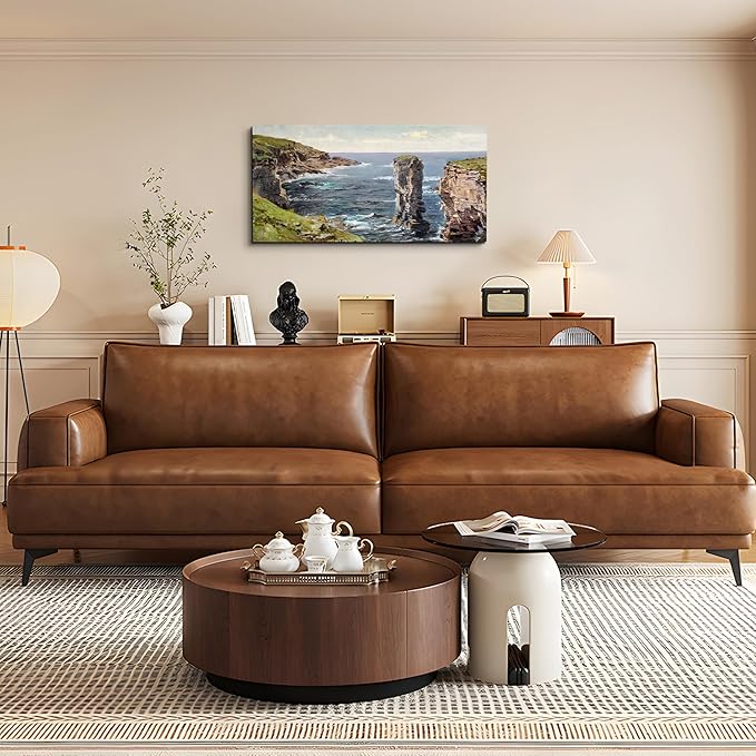 - Coastal Wall Art: Towering sea stacks rise dramatically from the ocean, as waves crash against the rolling, grass-covered cliffs along the coastline. Imagine waking up to the breathtaking beauty of this landscape wall art in your bedroom