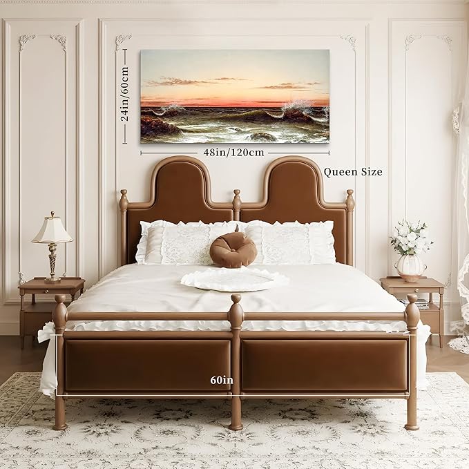 - Coastal Wall Art: This vintage wall art captures the majestic beauty of the sea at sunset, with warm hues from the setting sun painting the sky in shades of orange and red, and the viewer can almost feel the sound of the waves and the gentle ocean breeze