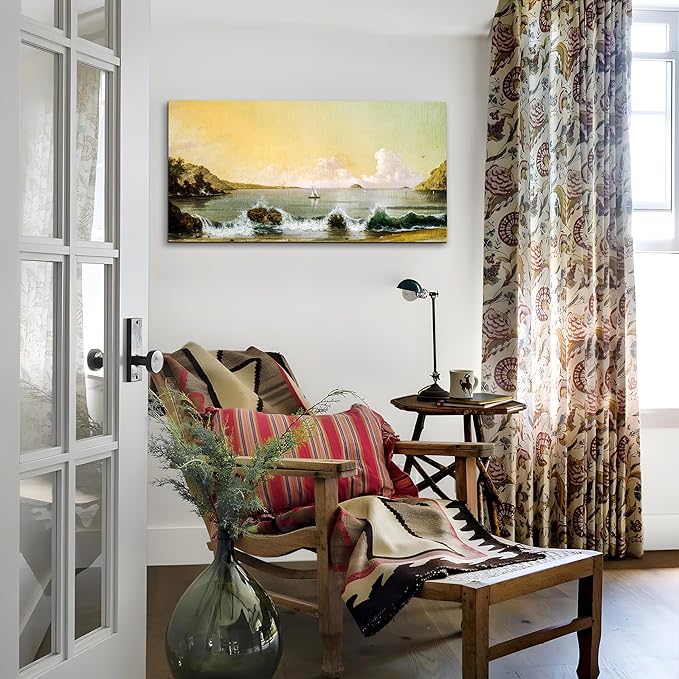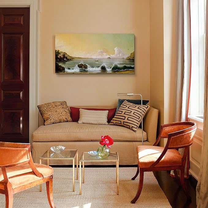 crmotu Large Landscape Wall Art, Beach Sunrise Dawn Vintage Painting, Bay Sailboat Scenery Art Prints, Coastal Wave Aesthetic Canvas Wall Decor Living Room Bedroom, Retro Nautical Pictures 20"X40"