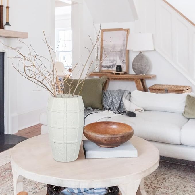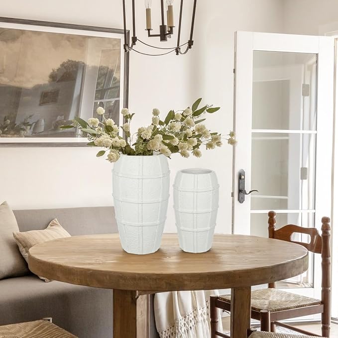 Briful Rustic Terracotta Flower Vase for Home Decor 12" White Farmhouse Textured Barrel-Style Ceramic Vase Vintage Handcrafted Gridded Design for Faux & Dried Flowers Living Room Table Centerpiece