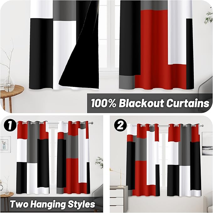 - ๐ฅEASY CARE: Our minimalist red black geometry printed blackout curtains are easy to maintain. Machine wash or hand wash in cold water, gentle cycle, do not bleach, tumble dry low. Quality curtains will withstand times of use.