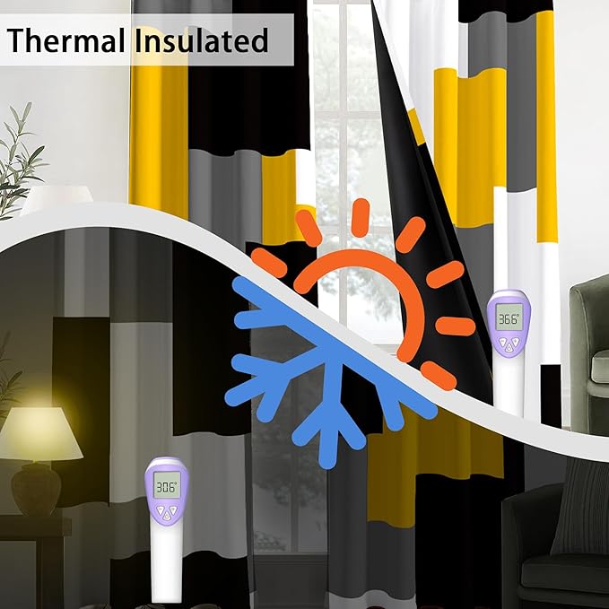 - ๐จTHERMAL INSULATING SOUNDPROOF CURTAINS: Our elegant yellow grey black white plaid print thermal insulated drapes can balance indoor and outdoor temperatures well, retain heat indoors during the winter and reject heat in the summer, and effectively energy saving. In addition, it can noise reducing and total privacy, providing a quiet and peaceful environment for you to relax in.