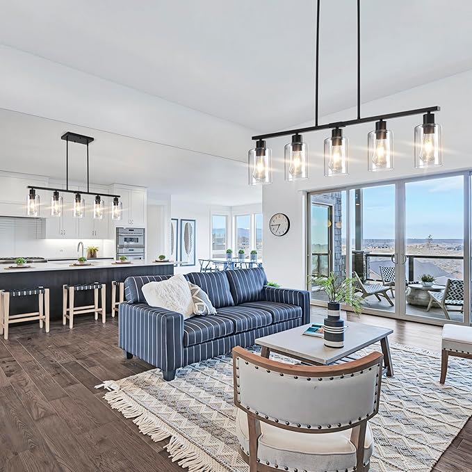 - 【Industrial Farmhouse Aesthetic】Combines matte black metal frame with clear seeded glass shades for rustic-modern appeal. Rectangular silhouette (31.5"L x 11.8"W) complements open-concept kitchens and dining areas.