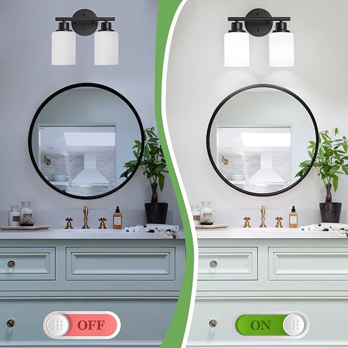 - MILKY WHITE FROSTED GLASS SHADE: This 2-light bathroom vanity lights is crafted with a sleek matte black finish and a textured milky white glass shade. Bathroom lamp can softly diffuse light and reduce glare and eye fatigue. Bathroom light fixtures over mirror is perfect for makeup and grooming