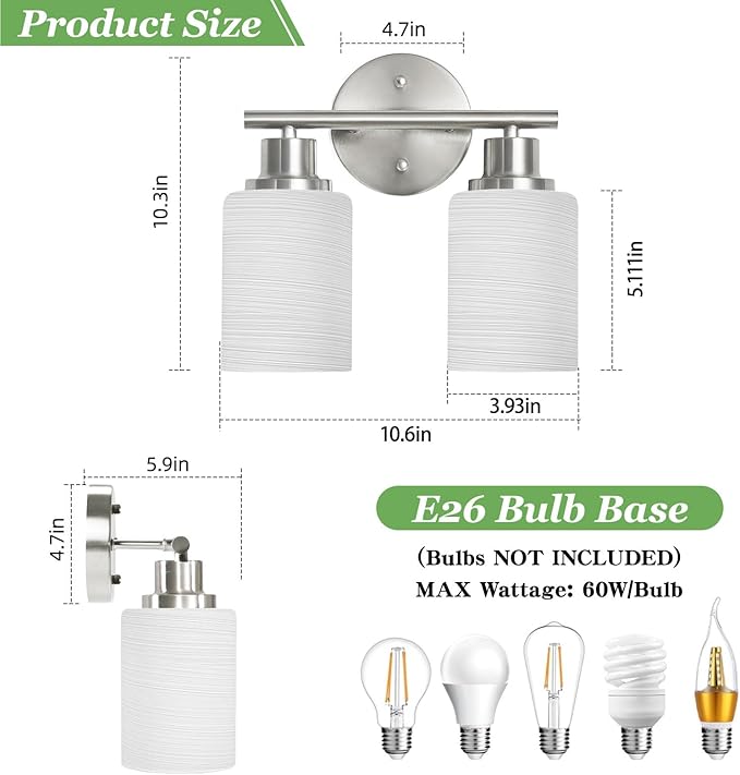 - HEAT-RESISTANT E26 SOCKET: Brushed nickel vanity lights for bathroom is compatible with any E26 base bulb(MAX 60W/bulb), vanity mirror lights supports various bulb types, including incandescent, CFL, halogen, and LED bulbs. Bathroom wall light fixtures allowing you to choose from different bulb styles to control the desired brightness