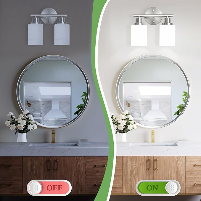 - MILKY WHITE FROSTED GLASS SHADE: This 2-light brushed nickel bathroom light is crafted with a sleek finish and a textured milky white glass shade. Bathroom lamp can softly diffuse light and reduce glare and eye fatigue. Bathroom light fixtures over mirror is perfect for makeup and grooming
