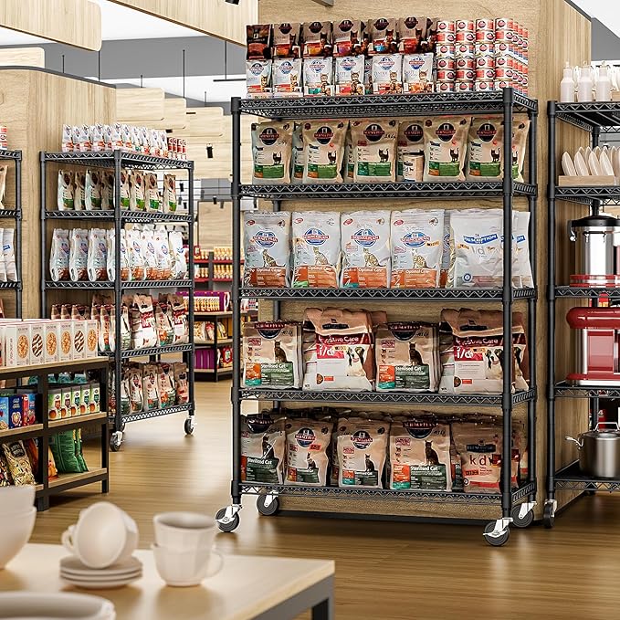 - COMMERCIAL GRADE HEAVY DUTY: Craft from study high-quality carbon steel and 25.4mm metal rods, each shelving unit has a maximum capacity of 660LBs on leveling feet, with a total capacity of 2640 LBs (Approximately 530 LBs on wheels.)