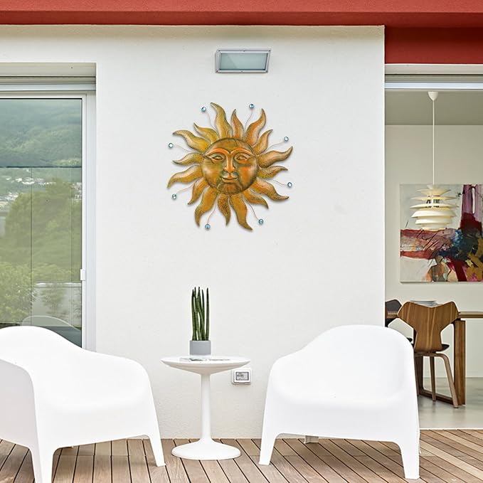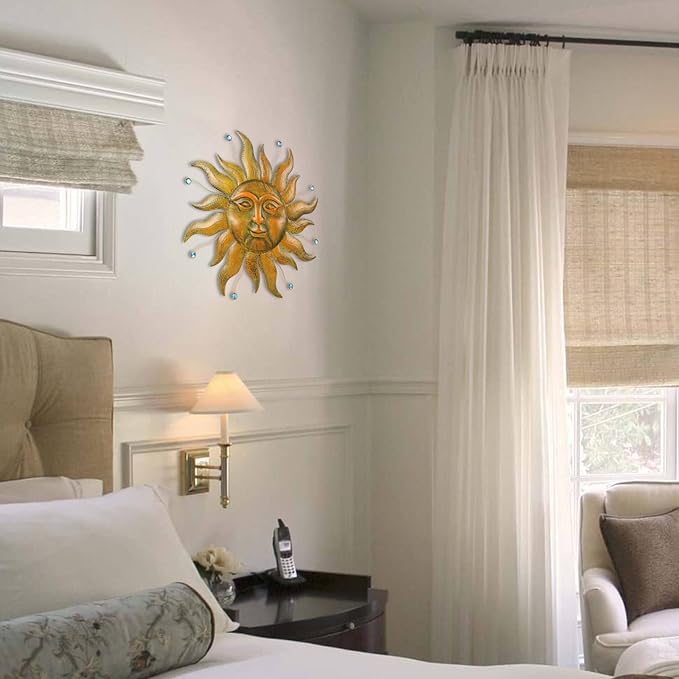 - Sun Wall Decor: Sun metal wall art features a vintage gold color scheme, depicting a warm and friendly sun face with petal shaped flames surrounding it, complemented by blue beads. The entire wall hanging art creates a natural and artistic atmosphere.