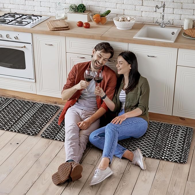 - Versatile:Geometry farmhouse style kitchen rug with diamond pattern easily to match your kitchen decor, bright your home.Soft thick foam provides ample support for standing in kitchen sink, laundry room, office, bathroom, dinning room, or any other high-traffic aera