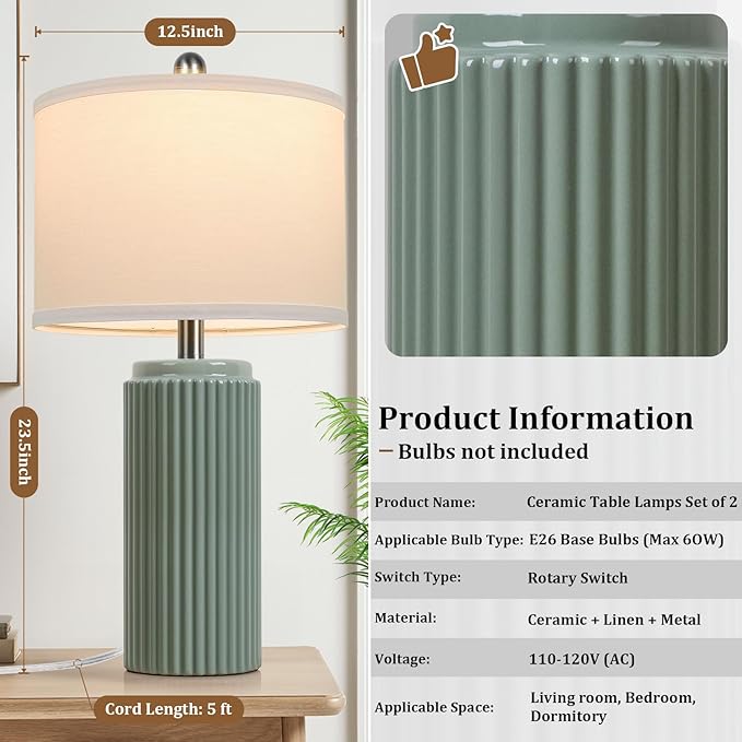 - 【Ceramic Table Lamps Set of 2】The ceramic living room lamps are designed with an exquisite green polished process and a unique vertical stripe pattern, which can easily fit into most decorative styles such as modern, classic, country, vintage, farmhouse, Northern Europe, boho, and more. Carefully selected high-quality ceramic materials make the table lamps durable, scratch-resistant, and fading-resistant. As a result, the ceramic table lamps can always keep their magnificent appearance