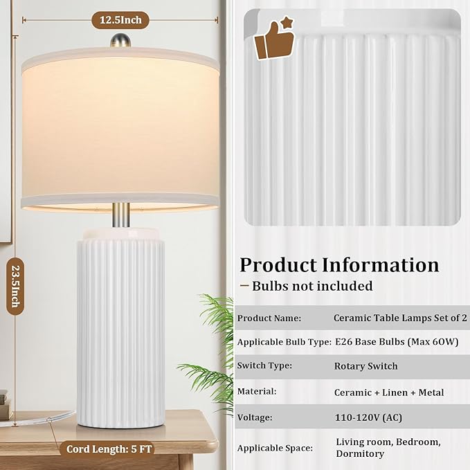 - 【Ceramic Table Lamps Set of 2】The ceramic living room lamps are designed with an exquisite white polished process and a unique vertical stripe pattern, which can easily fit into most decorative styles such as modern, classic, country, vintage, farmhouse, Northern Europe, boho, and more. Carefully selected high-quality ceramic materials make the table lamps durable, scratch-resistant, and fading-resistant. As a result, the ceramic table lamps can always keep their magnificent appearance