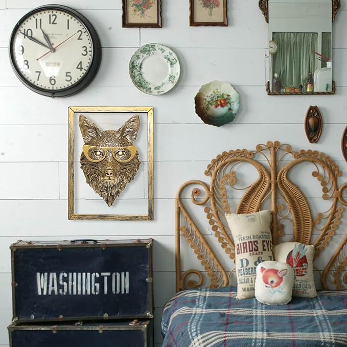 Animal Heads Wall Decor (Includes Metal Frame) Resin Animals Sculptures Head Wall Hanging Decoration Gold vintage Wall Sculpture for Living Room Bedroom Office(Fox)