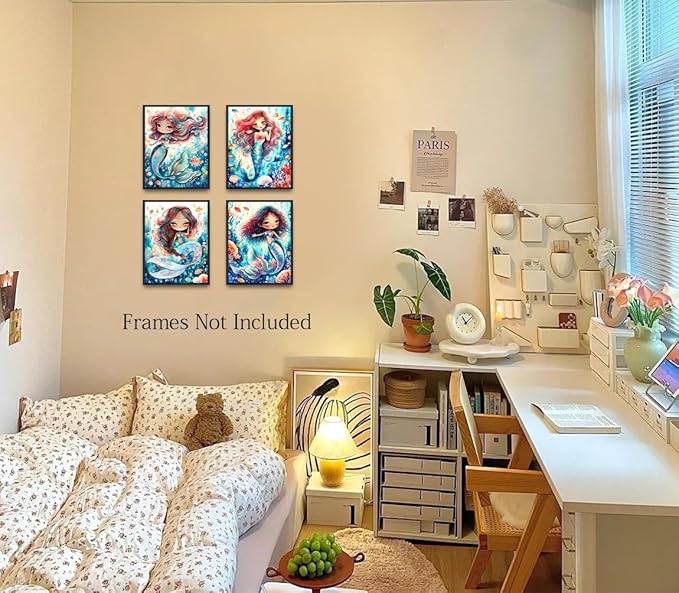 - ๐โThis Set of 4 (8"x10" Unframed) Mermaid Room Decor for Girls Bedroom includes vibrant and detailed prints that will captivate the imagination. Each piece is designed to fit seamlessly into your Bathroom or Nursery, creating a serene and enchanting atmosphere.