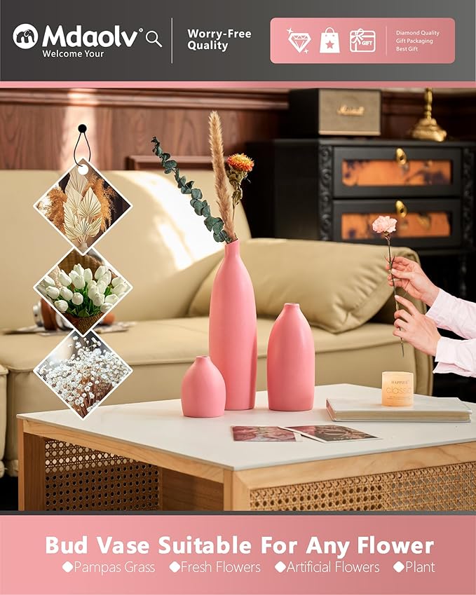 - Simple Modern Boho Pink VasesHome Decor - Our modern and simple vase set has an elegant pink style and a simple modern look that can blend perfectly with any decor style, bringing elegance and romance to your home. Decorate your living room, kitchen, bedroom, bathroom or office with these small pink ceramic vases. These modern bohemian pink vases are perfect centerpiece table decorations. They will also look great on your shelves, mantels, entry tables, etc.