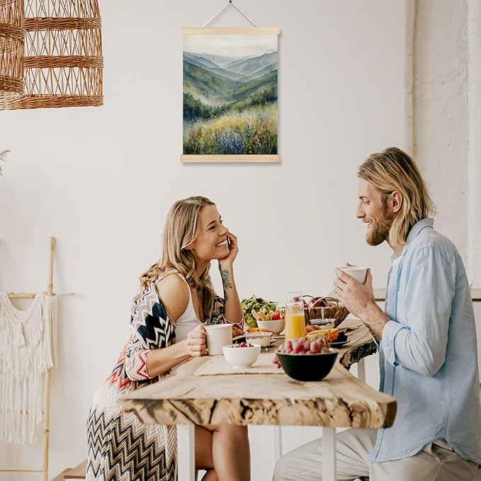 FITIE Green Mountains Forest Wall Art, Mountain Wall Decor, Rustic Farmhouse Forest Wall Art Decor, Watercolor Blue Ridge Mountains Wildflower Nature Landscape Canvas Wall Art Poster Hanger Frame, 12x16 Inches