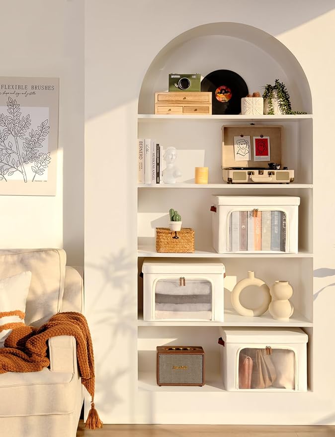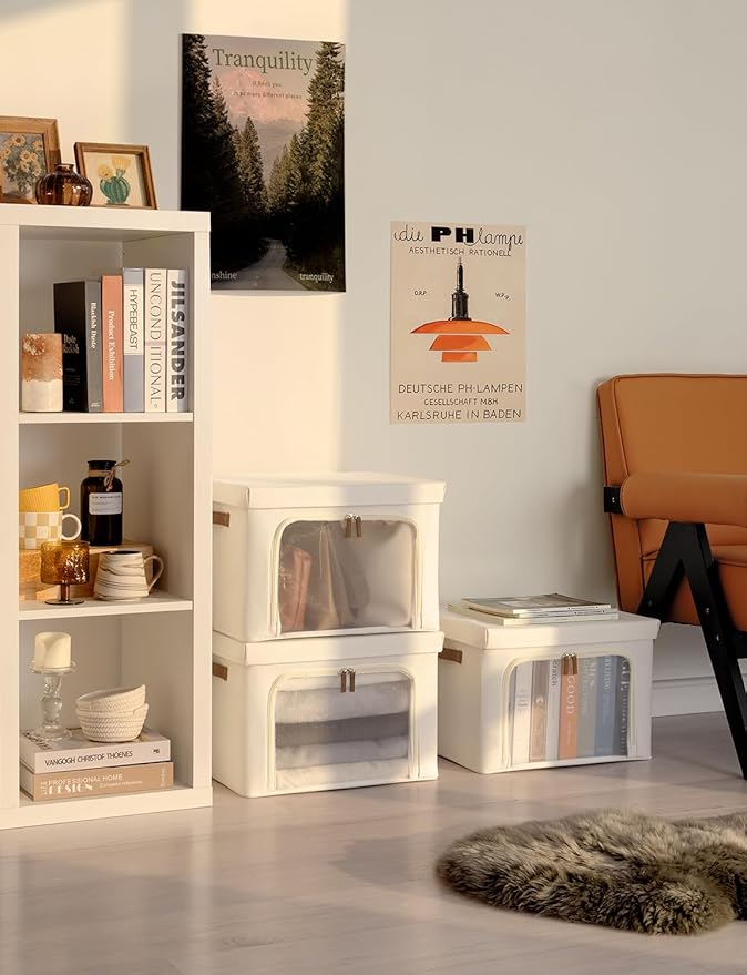 StorageWorks Storage Bins with Lids, Decorative Boxes with Clear Window for Clothes, Fabric Collapsible Baskets for Closet Organization, Large, Beige, 3 Packs