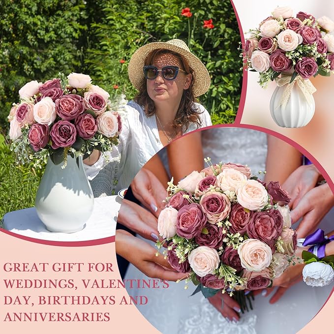 - Long Lasting and Easy to Care: the artificial peonies do not require water or sunlight; They are easy to clean and remove the dust; The faux peonies bouquet is a proper alternative for those who have no time to take care of flowers; You don't need to spend a lot of time on them to keep them alive; Artificial bouquets are not seasonal, you can enjoy these all year round