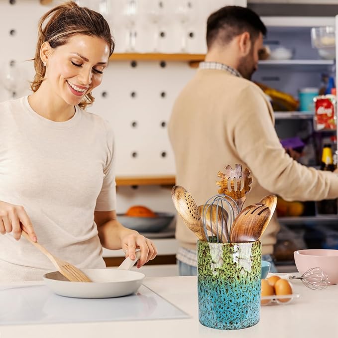 Utensil Holder, Ceramic Kitchen Utensil Holder for Countertop, Large Cooking Utensil Crocks for Kitchen Counter, Morden Utensil Organizer for Spatula, kitchen Decor,Green & Blue