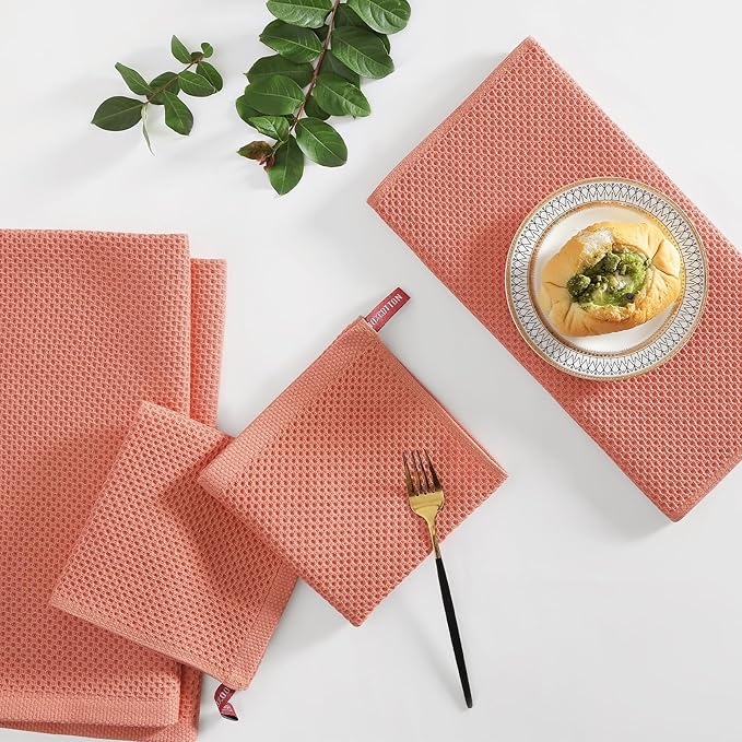 Homaxy 100% Cotton Kitchen Towels and Dishcloths Set, 12 x 12 Inches and 13 x 28 Inches, Set of 12 Bulk Kitchen Towels Set, Ultra Soft Absorbent Dish Cloths for Washing Dishes, Coral