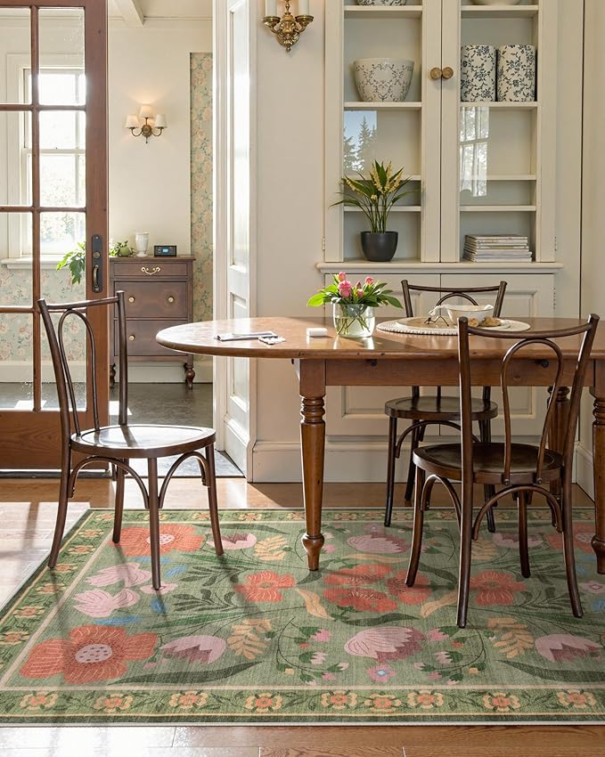 Beeiva Green 5x7 Area Rugs, Floral Machine Washable Living Room Area Rugs Non Slip Non-Shedding, Flower Ultra Thin Carpet for Living Room Dorm Playroom Décor (Green,5'x7')