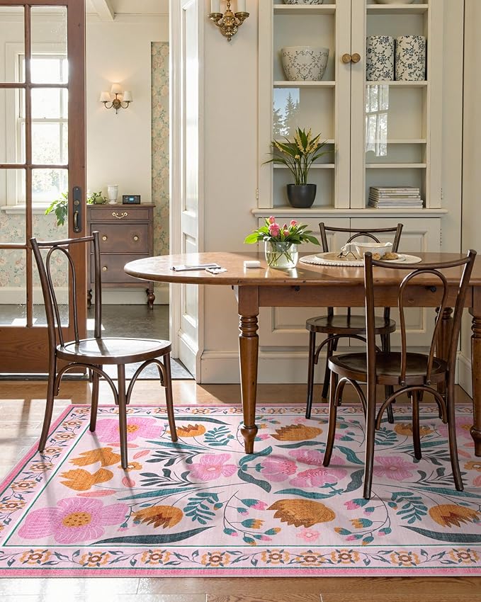Beeiva Pink Flower 5x7 Rugs for Bedroom Girls, Nursery Rug for Dorm Carpet with Low-Pile Non Slip, Soft Floral Indoor Ultra-Thin Carpet for Classroom Living Dining Room Décor (Pink,5'x7')