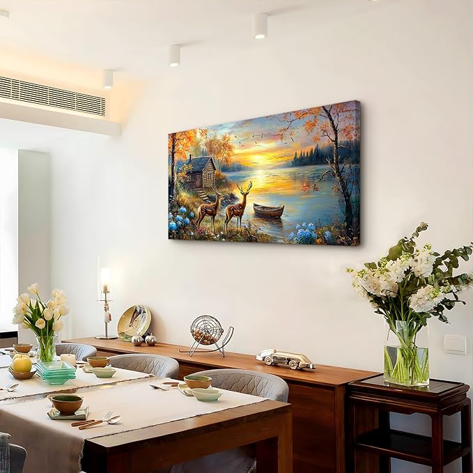 - Fall Wall Art: This landscape wall art captures the stunning beauty of an autumn lakeside scene, featuring a rustic cabin and two elk in the nearby forest, with a small boat resting on the calm lake, shimmering with the golden glow of the setting sun