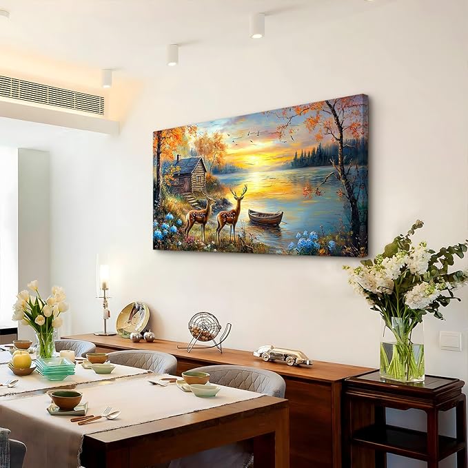 - Fall Wall Art: This landscape wall art captures the stunning beauty of an autumn lakeside scene, featuring a rustic cabin and two elk in the nearby forest, with a small boat resting on the calm lake, shimmering with the golden glow of the setting sun