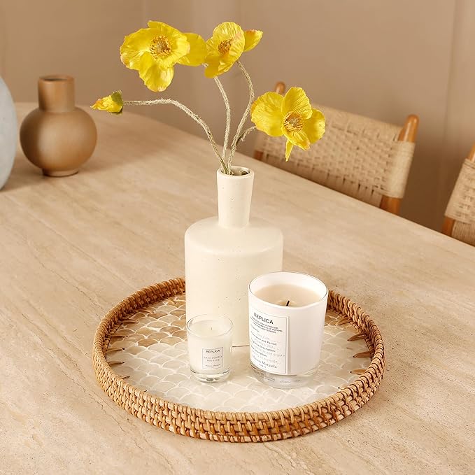 - Handwoven with Care: Each tray is carefully woven by skilled artisans, natural rattan texture and the subtle shine of seashells, reflecting a high level of craftsmanship and attention to detail