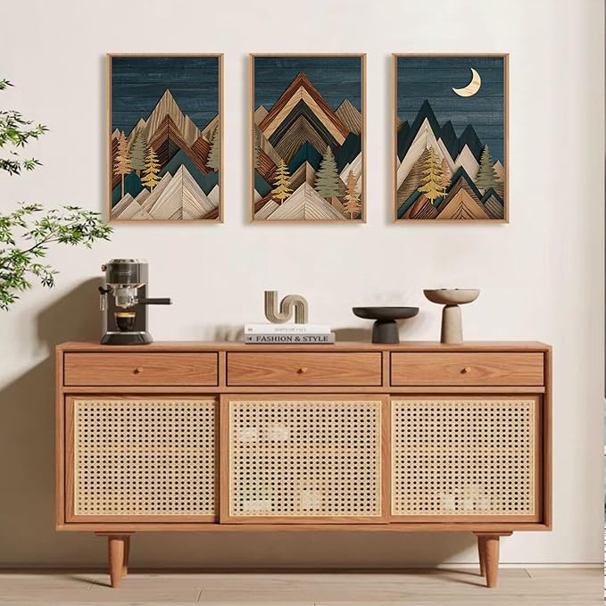 - 【Country Woodcut Style Wall Art】The decorative paintings feature a woodcut style design with dark as the primary tones. They skillfully integrate elements of mountains, trees, and moon to create a fresh and retro aesthetic.
