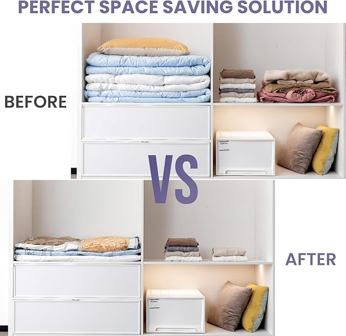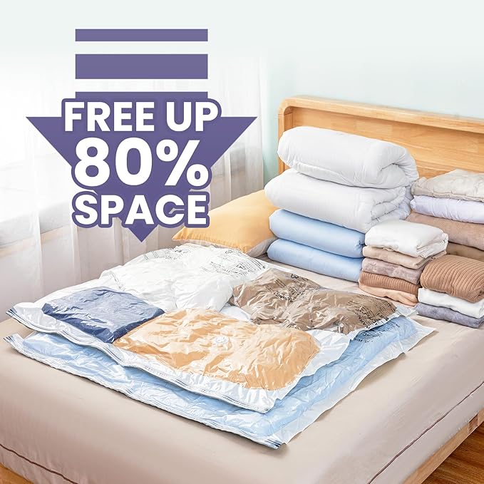 - Increase more storage space: Our long side zip design vacuum storage bags give you better storage solutions and save 3 times space by fast compression in a short time. Store away your clothing, bedding, comforters, blankets, pillow and more, help you save more in less space