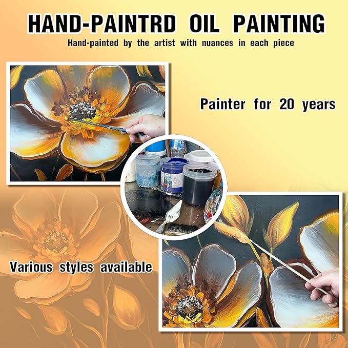 - 【Canvas Mural Size】Titled "Gold Flower" The size is 59" x 29". Since each painting is hand-painted, the actual painting may differ slightly from the product image. Due to different monitor brands, the actual wall painting color may be slightly different from the product picture.