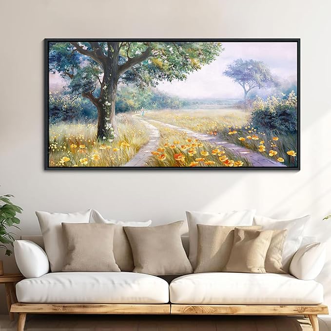 - Farmhouse Framed Wall Art: This hazy rustic landscape wall art for various home styles,romantic blend of tones flowers trees creating a soothing and tranquil atmosphere,canvas art paintings a perfect addition to your living room or bedroom