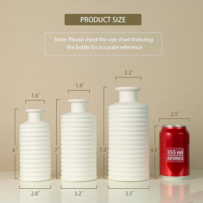 - Size — This set includes small to medium-sized vases. Please refer to the size reference image for an accurate understanding of the dimensions. Perfectly sized for entryway tables, dining tables, kitchen islands, bookshelves, coffee table, vanities or nightstands.
