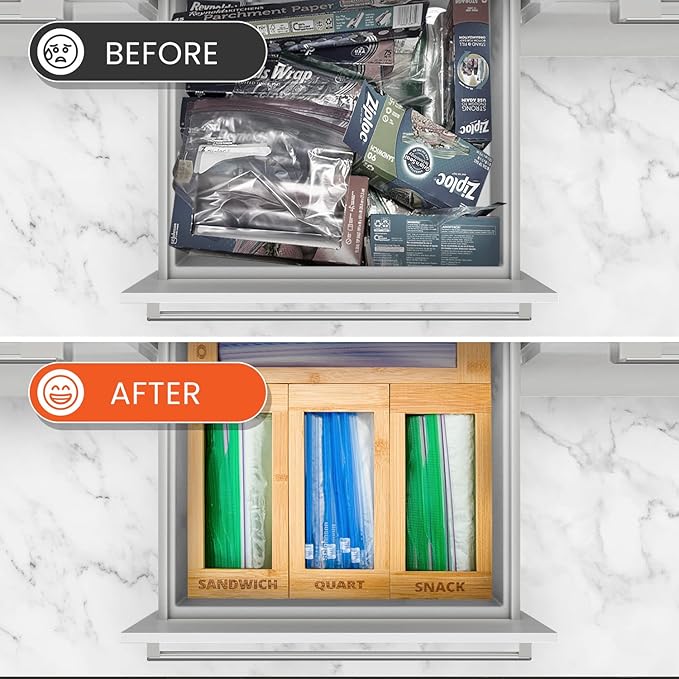 - Comes Ready To Use - Transform your kitchen with ease, mess-free, and with no hassle! Our kitchen bag organizer for drawers comes fully assembled and with non-slip dots.