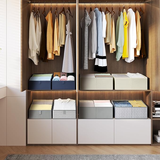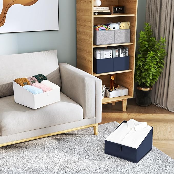- 【Trapezoidal Design】These storage cubes are Trapezoid design that makes finding things convenient, also allows easy access when putting on the highest shelf. These are ideal closet bins for clothes, bags, shoes, towels, blankets, toys, dolls, and more