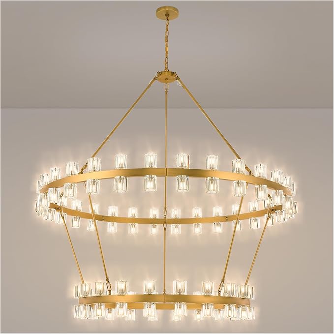 60 Inch Gold Wagon Wheel Chandelier with Crystal Shade, 2 Tier 100 Lights, Modern Farmhouse Style, Ideal for Dining Room, Kitchen, Entryways