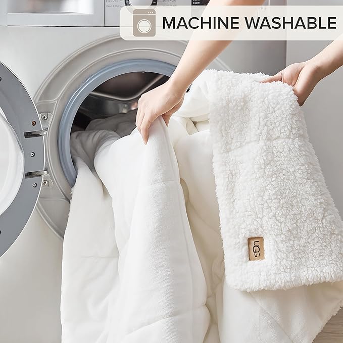 - White Cozy Throw Blanket: This reversible throw features box stitching on one side and white plush UGG Fluff on the other, delivering a soft and warm blanket feel. The medium-weight blanket adds a stylish touch to bedroom or living room decor.