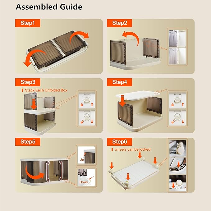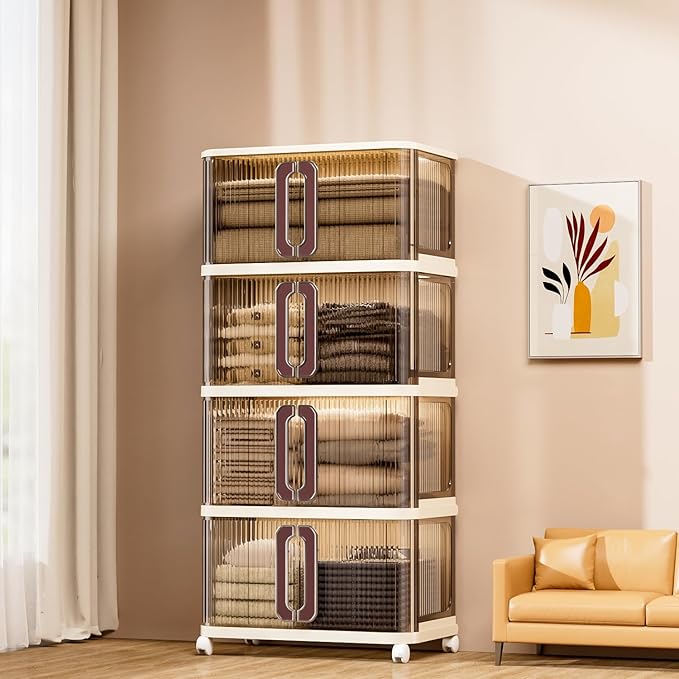 - Stackable Storage Bins: Each package includes 4 storage box, one lid, and 4 wheels. Our collapsible storage bins each layer can be stacked freely can save room space without occupying too much floor area. With 4 upgraded reinforced latches are located at each top to ensure studiness stack, hidden and more stable secure when tilted or moved, ensuring maximum safety during use.