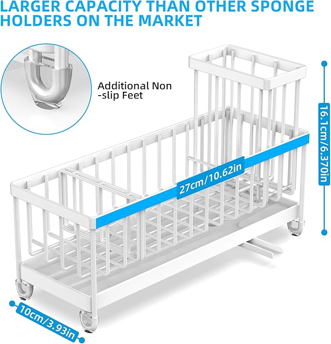 - 【LENGTH UPGRADE LONGER VERSION】Moforoco Lengthen sponge holder has increased the length by 1.37 inches compared to the regular 9.25-inch length on the market, and the total length is 10.62 inches. It means you can accommodate 2 * soap dispenser bottles, 4* brushes, and a sponge, making your storage space easier, accommodating more of your items and saying goodbye to clutter.