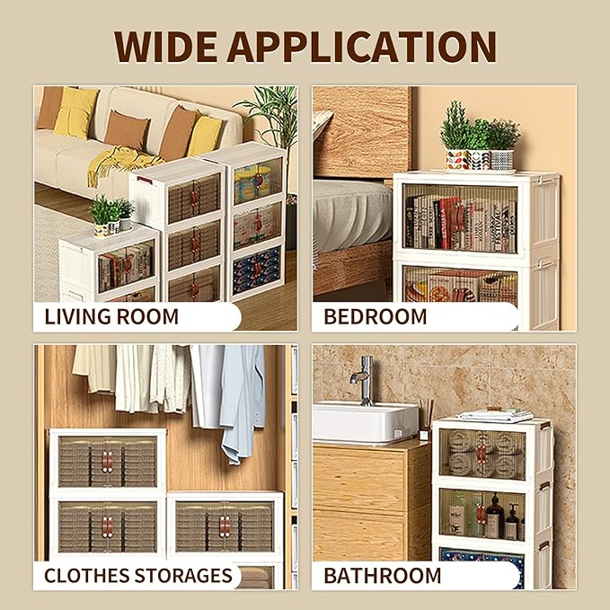 - 【Clear Visibility & Space-Saving Mobility】Transparent open-front panels provide instant content access, paired with stackable storage bins with wheels for smooth mobility across floors. Tool-free assembly snaps layers in seconds, while the foldable storage cabinet adapts to compact spaces like entryways or dorm rooms. Magnetic closures secure doors, maximizing vertical storage in collapsible units, and the wheels could be locked in place for security needs