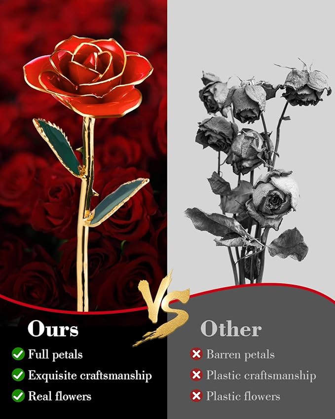 - 🌹【15 Days of Exquisite Craftsmanship】Carefully selected beautiful rose in bloom - dipped in 24K gold to preserve the roses for a lifetime. Next, they are dipped and plated with 24K gold to create a breathtaking masterpiece for you to enjoy for a lifetime. Making each rose is a time-consuming process that requires more than 32 meticulous steps and 15 days of handwork by skilled craftsmen and technicians.Ps:we must declare that the rose is 24K gold plating, NOT all 24k gold.