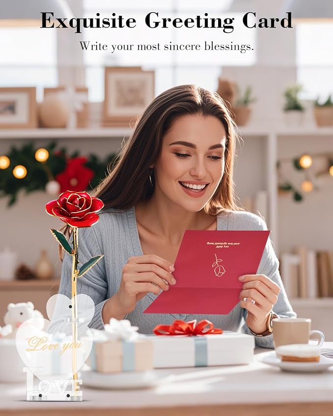 - 🌹【Premium Gift Box Packaging】A single gold-plated rose is equipped with a high-end gift box packaging, with roses and blessing text elements added, which is very suitable for gift giving; the exquisite gift box is sealed for storage, safe and dustproof. It also comes with a packaging bag and a greeting card, and the gift giving is completed with one click.